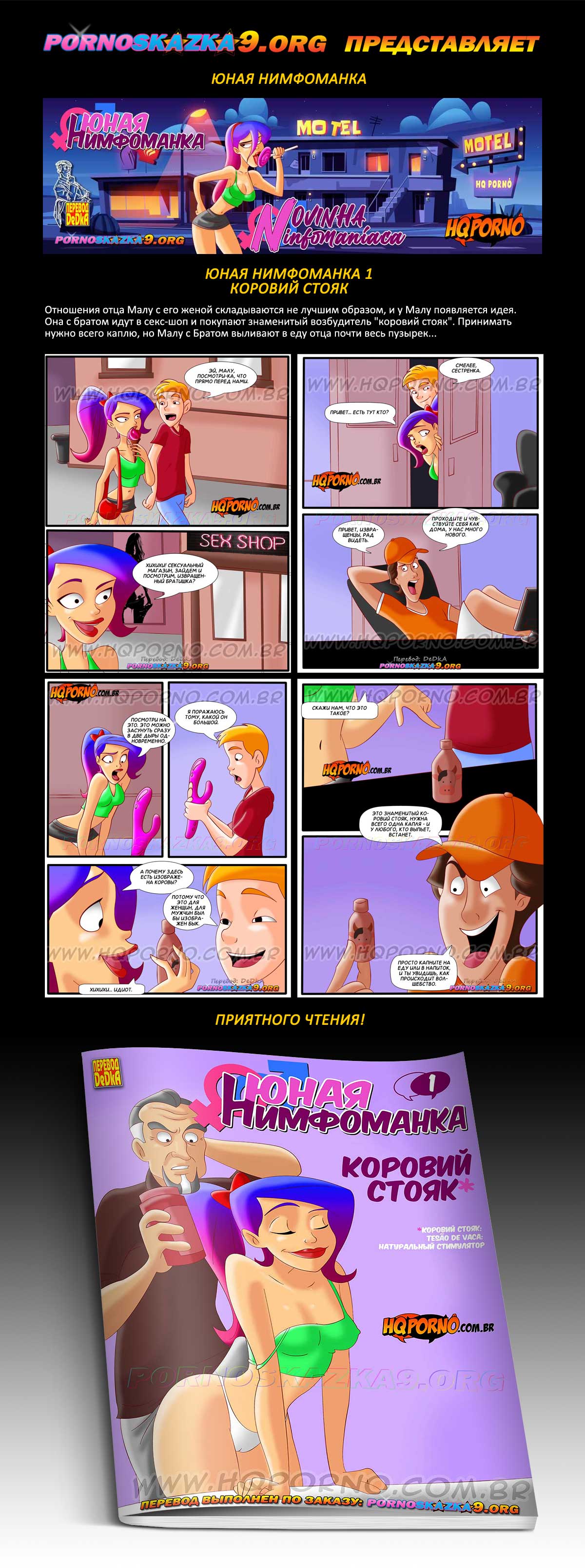 Порно комикс «Юная нимфоманка. Часть 1. Коровий стояк.» Отношения отца Малу с его женой складываются не лучшим образом, и у Малу появляется идея. Она с братом идут в секс-шоп и покупают знаменитый возбудитель «коровий стояк». Принимать нужно всего каплю, но Малу с Братом выливают в еду отца почти весь пузырек…